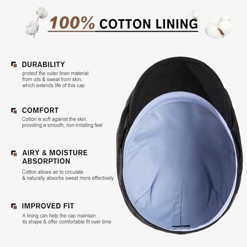 Crafted from 100% eco-friendly natural linen, our flat cap is a responsible choice for those who want to minimize their environmental footprint. The cotton-lined interior enhances comfort, making it perfect for summer, spring, and fall.